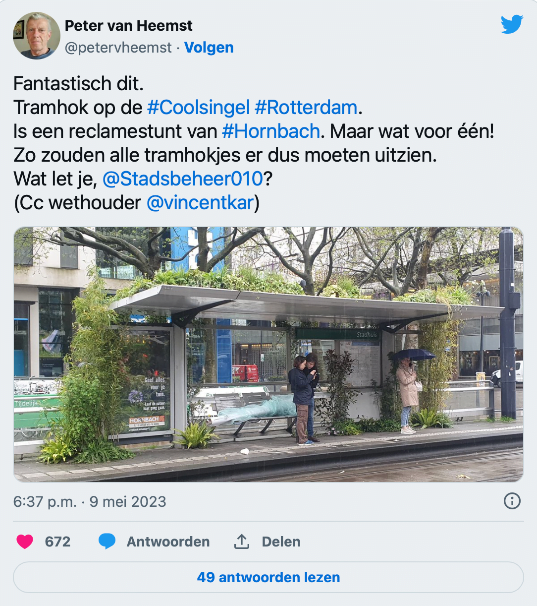 ‘Fantastisch, zo zouden alle tramhokjes er moeten uitzien’, verzuchtte Peter van Heemst op Twitter. Hij doelde hierbij op de tramhalte op de Coolsingel waar een tramhuisje weelderig is versierd met planten. Het gaat hier om een tijdelijke reclamestunt. ‘Maar wat voor één!’